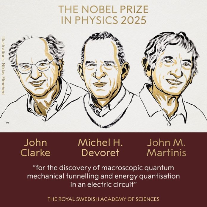 Academia Regală Suedeză de Științe a anunțat marți, 7 octombrie 2025, laureații Premiului Nobel pentru Fizică din acest an: cercetătorii americani John Clarke, Michel H. Devoret și John M. Martinis. Distincția le-a fost acordată pentru „descoperirea tunelării cuantice macroscopice și cuantificarea energiei într-un circuit electric”, potrivit comunicatului oficial publicat pe nobelprize.org